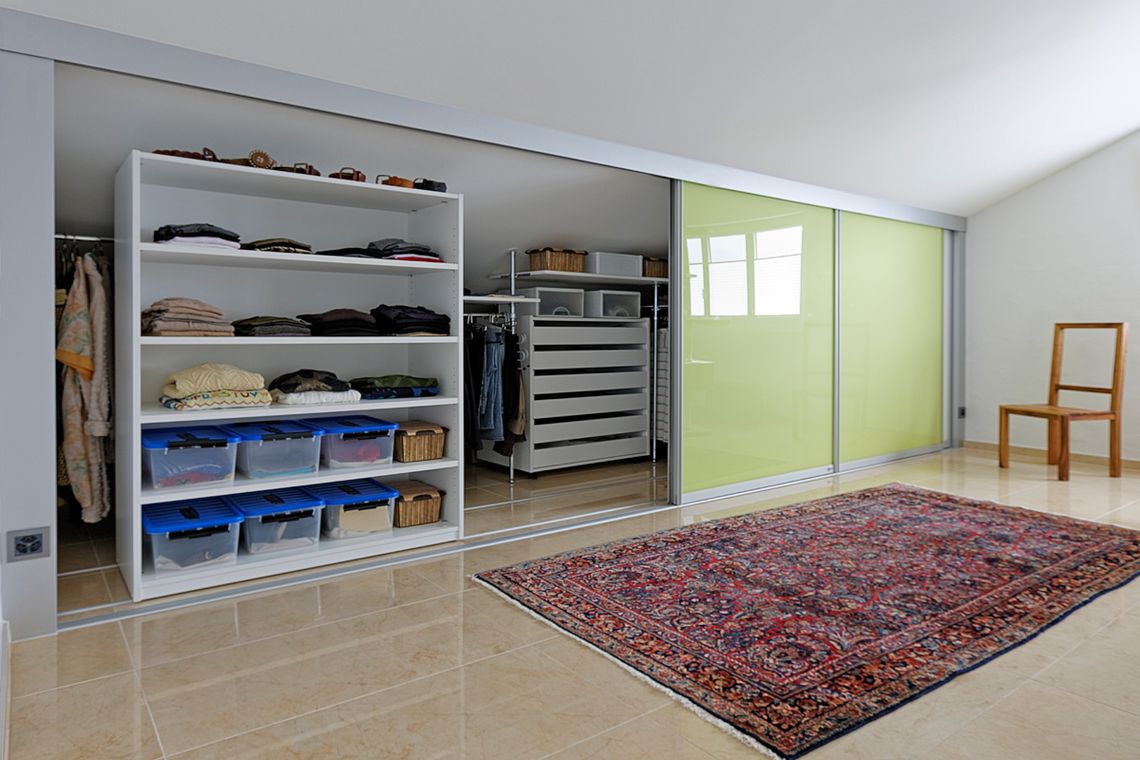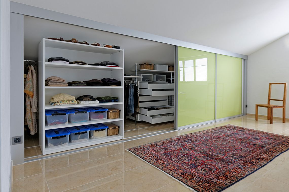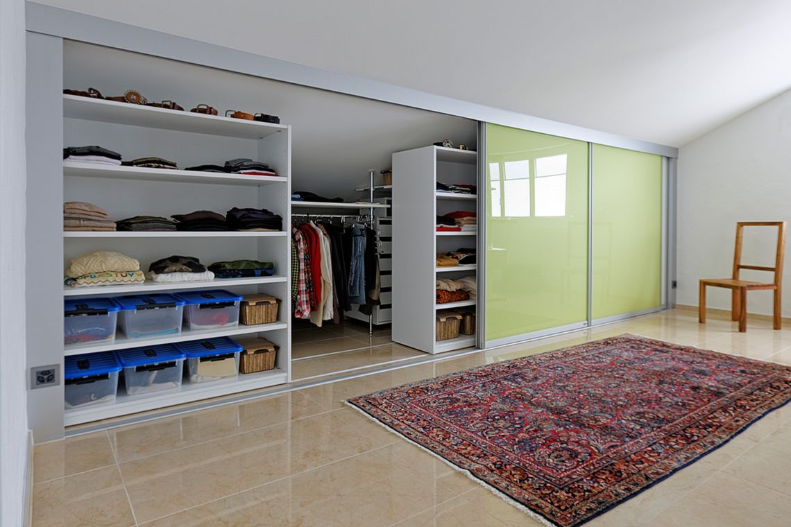 Jede AUF&ZU-Schrankanlage wird nach den Bedürfnissen der Kunden und den Raumverhältnissen individuell nach Mass gefertigt. Weil das Konzept keine Rück-, Seitenwände oder Bodenplatten vorsieht, ist eine maximale Raumnutzung möglich. Bei diesem Projekt unter einer Dachschräge wurde ein doppelt tiefer Kleiderschrank gewonnen. Schieberegale werden seitlich verschoben, um eine weitere Ebene für Hängebekleidung freizugeben. Anstatt für Schubladen hat sich die Hausfrau für Boxen entschieden, die in den Schieberegalen untergebracht sind. Es bleibt auch reichlich noch Platz für Pullis, T-Shirts, Gürtel und andere Nippes. Im hinteren Bereich, zwischen den Säulen, steht ein Ladenkorpus mit sechs halb offenen Schubladen übereinander. Dieser Ladenkorpus steht auf Rädern und kann jederzeit anderweitig im Schrank platziert werden. Ein wichtiges Thema bei der Planung einer AUF&ZU-Anlage ist die Langlebigkeit und die absolute Flexibilität, denn jeder Mensch hat seine eigenen Vorstellungen und Gewohnheiten. (Projekt028-DS15)